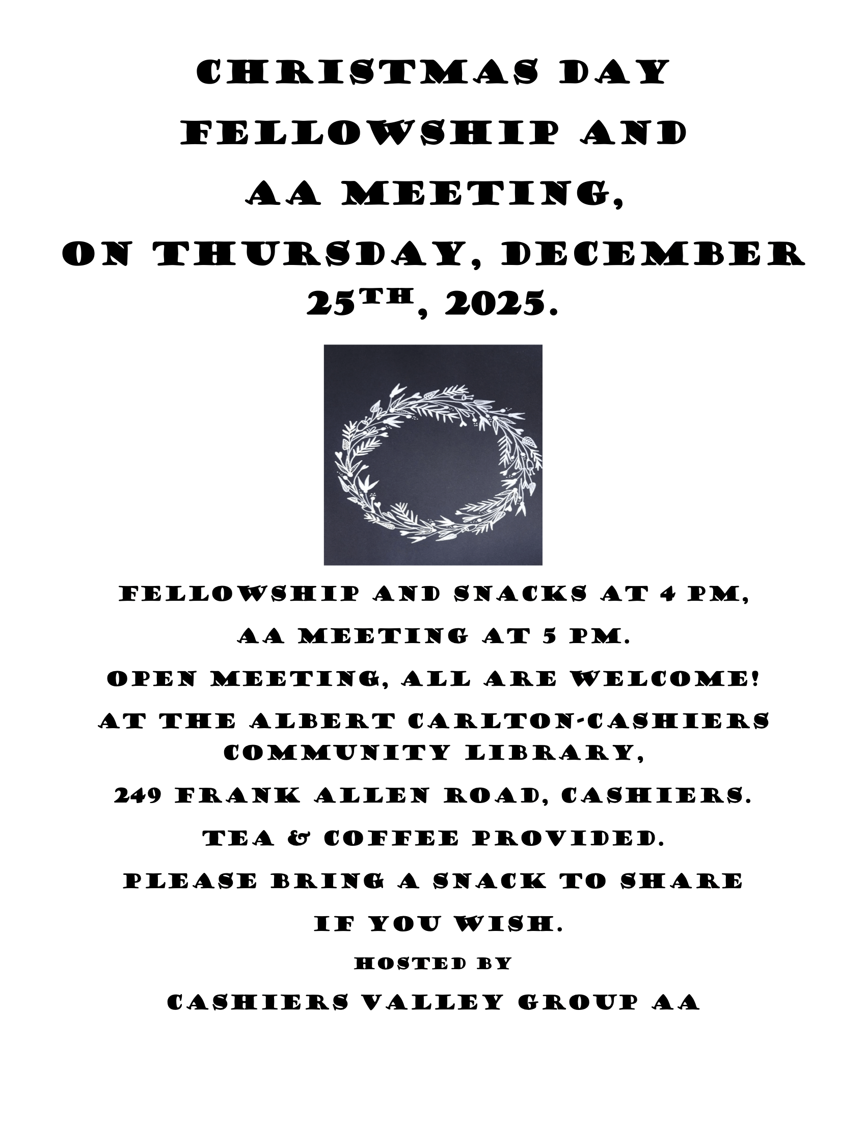 Cashiers Valley Group, Coffee & Tea provided, please bring snacks to share. Fellowship at 4pm, Open Meeting at 5pm. Come Join the Fun!