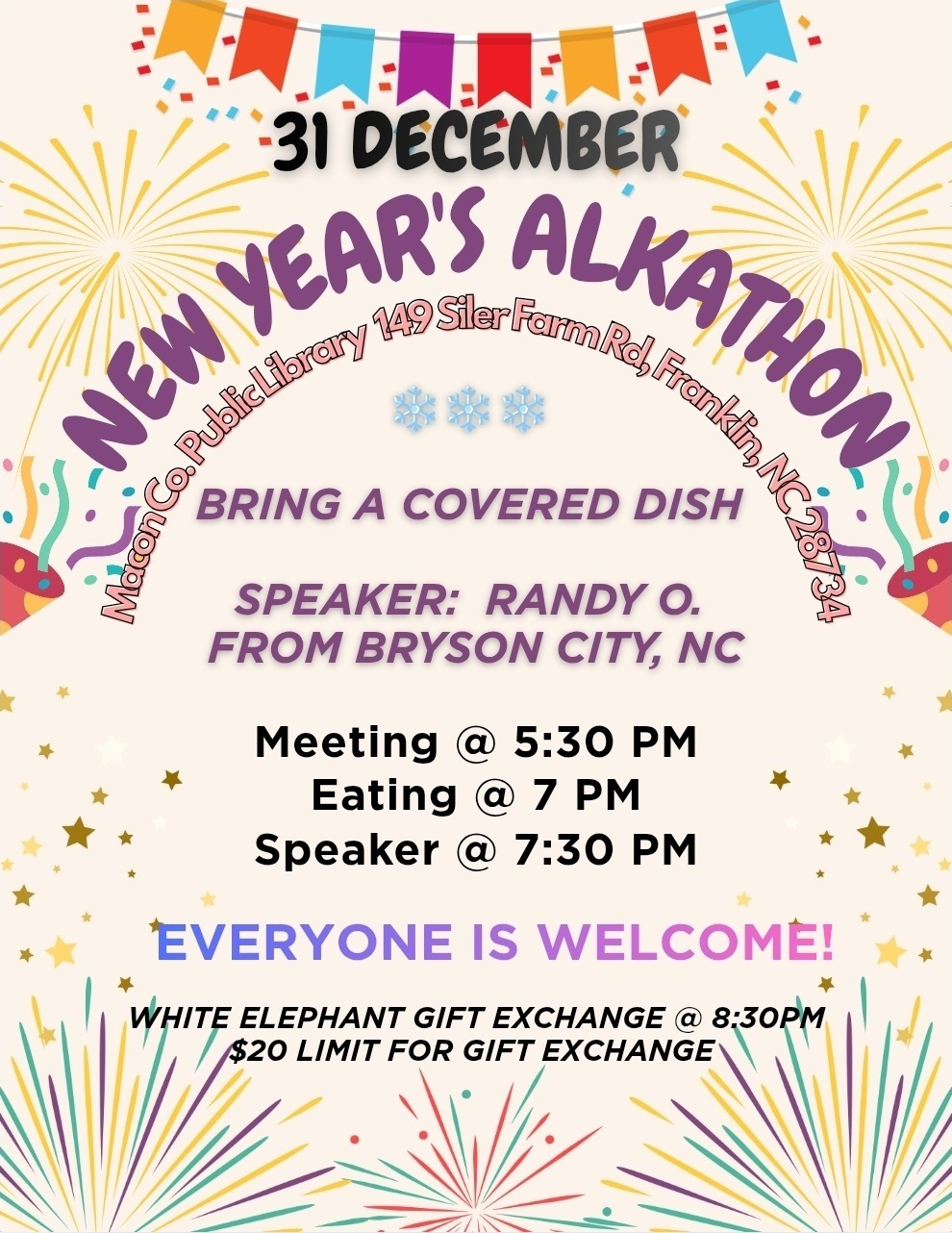 New Year’s AlkathonCome join us for food, fun & fellowship plus a good speaker!+ Add to Google Calendar+ iCal / Outlook export DateDec 31 2025 Time 5:30 pm LocationMacon County Library Category Eating meeting MeetingSpeaker Randy O Randy OAA World ServicesAA North Carolina Area 51Printable Meeting ScheduleMountain Doin'sAA Online Meetings